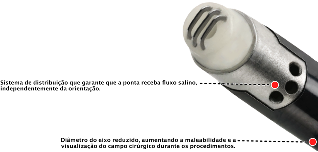- O campo de plasma de 100μm-200μm permite a remoção precisa de tecidos moles com um dano minimizado aos tecidos adjacentes. O sistema integra controle de solução salina, sucção e energia criando um dispositivo totalmente equipado com configuração rápida, permitindo economia de tempo nos procedimentos.